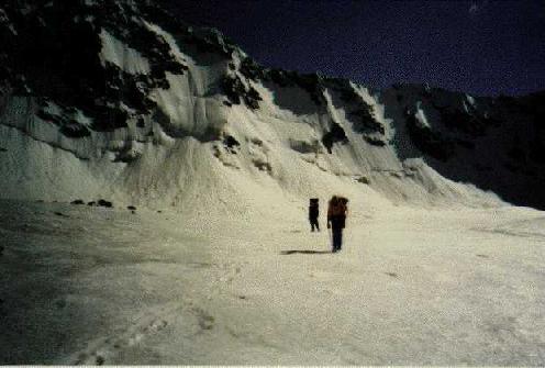выходами льда и снега, пересекающую весь скальный склон слева
