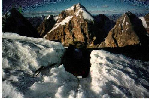 Мы примостились на снежном гребешке. К предвершинной пирамиде