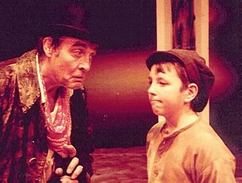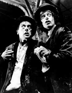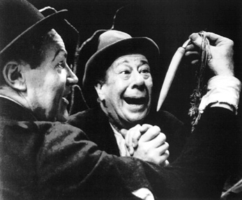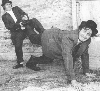 trousers which, much too big for him, fall about his ankles. They look at