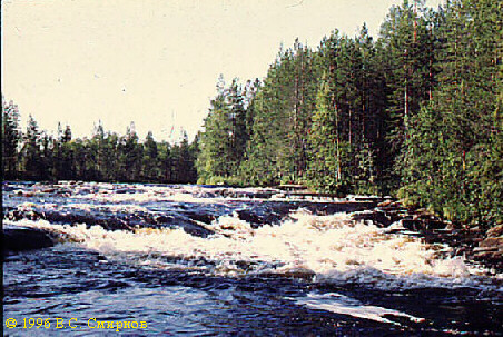 Порог No16 (Iа, 70 м). Вдоль левого берега вплотную по дуге. Остров у порога. Через 5 мин сплава -- оз. Вокшозеро. На правом берегу у выхода в озеро -- хорошая стоянка.