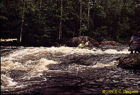 Порог No47 (IIб, 350 м). Первая часть -- шивера длиной около 100 м. Сходу. Дальше лучше осмотреть по левому берегу. Слив в середине порога и довольно мощная шивера (250 м). Сразу --