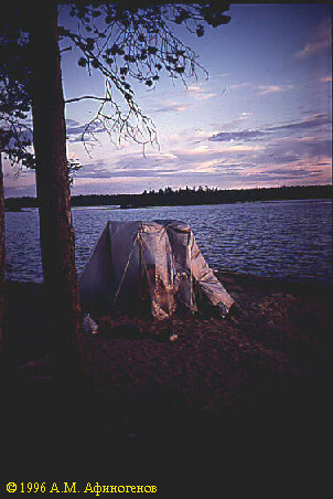 Стоянка на острове на оз. ВокшозероВне всяких сомнений, красивейшее оз. Вокшозеро не следует проходить напрямик. Отличные оборудованные стоянки с банями и пляжами -- в СЗ части озера, как на материке, так и на островах. Прекрасная стоянка в западной части самого крупного острова озера (крюк по озеру 3.5--4 км). Несколько дальше -- редко посещаемые стоянки на каменных мысах оз. Сухое (крюк -- до 15 км).