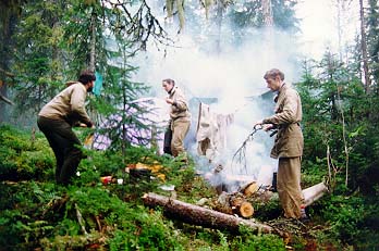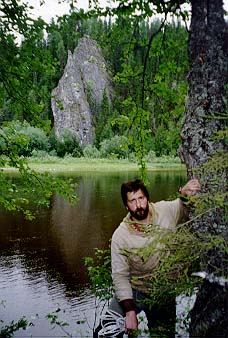 С утра пораньше, завидев дым разведенного Васей2 костра, заявился инспектор нац. парка Гаврилов с ржавым ружьем и напарником Димой. Как выяснилось- это главный человек на этой реке. Он проверил документы и выпил чаю, насыпав в кружку примерно полпачки заварки. Затем он проч?л лекцию по кинологии, поведав об особенностях разведения западносибирских лаек. Поговорили о ловле рыбы. Гаврилов сокрушался, что трудно достать хорошие бл?сны. Пришлось подарить парочку. Заодно Кира презентовал ему два патрона. Напоследок инспектор Гаврилов одарил нас тремя малосольными хариусами и флакончиком репеллента, а Дима снял нас видеокамерой. Инспектор Гаврилов стал еще одним символом похода. Не проходило и дня, чтобы его имя не поминалось.