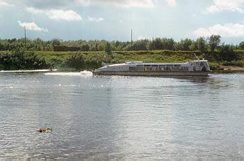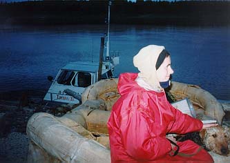 Мы вернулись, пообедали и пошли тормозить показавшийся буксир с баржей. Буксир не остановился, даже несмотря на то, что Васи на "Егере" подплыли к нему достаточно близко. Он просто не имел физической возможности остановиться, так как тянул вниз по течению некую громадную конструкцию. Но Васи покатались не зря. Они разглядели на противоположном берегу, где стояла здоровая шатровая армейская палатка и грузовик, довольно симпатичный катер. Кира с Васей2 отправились на переговоры. Не было их почти два часа. Выяснилось, что в этом месте зэки заготавливают сено, и катер этот принадлежит их начальству. А оно (начальство) отправилось ловить рыбу. Когда оно вернулось, нас согласились довезти сегодня до Щугора-8, где раньше находилась зона строгого режима, а теперь- колония поселения, а завтра с утра этим же катером довезти до Вуктыла, откуда ходит автобус до Ухты. Стоит это по сто тысяч с человека.