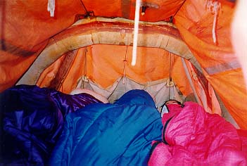 Когда мы подходили к камню, оно было левее нас, а когда "Егерь" уже был слева от камня, ПСН вдруг оказался правее и "Егеря" и камня. Байдарку на его месте просто размазало бы по камню, а ПСНу хоть бы что (за весь поход ни одна надувная часть его не была пробита). Сполз правее камня и пош?л дальше. Правда, спящие в н?м получили утреннюю информацию о температуре и степени свежести воды и насладились предчувствием кораблекрушения и команды "Полундра". Встали на завтрак в 7.00 не доходя Средних ворот. Вскоре морось исчезла и вышло солнце.