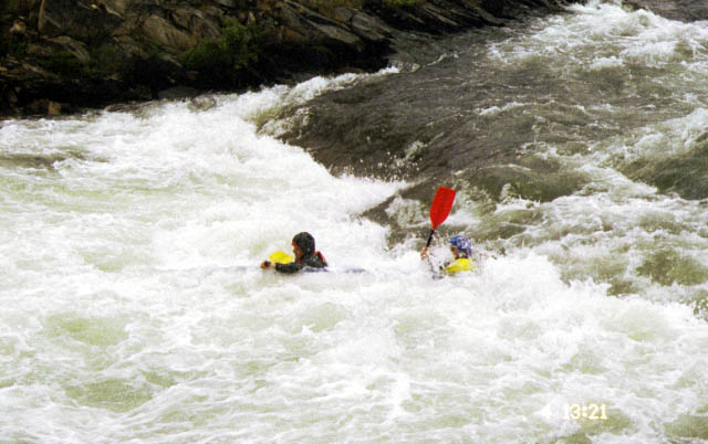 Итак, мимо Киры, который уже занял свое место в перевязанных упорах, и Димки Куликова, который начал перетаскивать "Матрас" к верхнему краю улова, проплывает девушка и просит помощи. Решение принимается совместно и незамедлительно. Под вопль Киры: "Садись быстро!" Димка прыгает в лодку, и они бешено начинают выгребать на струю. Теперь уже Димка не успевает встать в упоры, а место старта, выбранное впопыхах, не позволяет им поставить судно вдоль струи, и в Б1 третьей ступени их кладет. Внимание многочисленных зрителей теперь обращено уже на два терпящих бедствие судна. Между тем девушка вместе с каяком входит в котел Б2 и повторяет печальный опыт Димки образца 1995 г. - в весьма жесткой Б2 судно и экипаж почти неизбежно теряют друг друга. Теперь даже с берега видно, что положение девушки более чем критическое - она потеряла предпоследнюю опору (весло все еще при ней) и с трудом удерживает голову над водой. Спасает то, что она уже вышла в шиверную четвертую ступень.